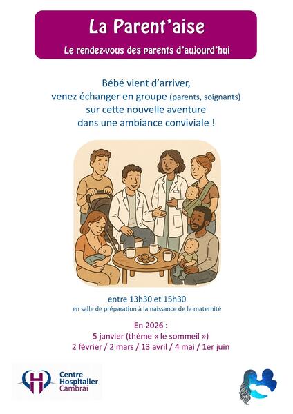 un groupe d'échanges entre jeunes parents et soignants (maternité et maternologie) ! Une réunion par mois, pour parler de cette nouvelle (ou non) aventure qu'est la parentalité !